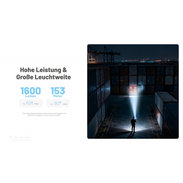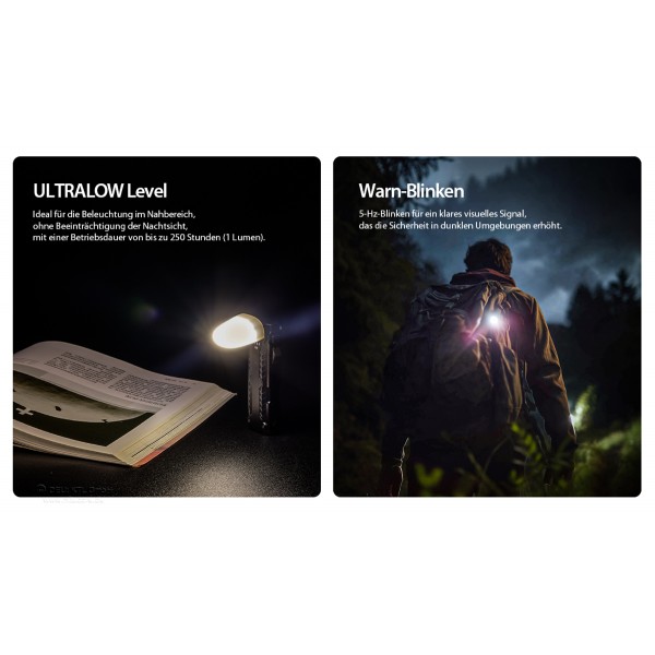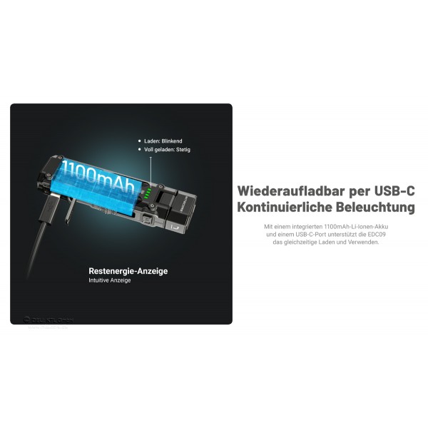 Der integrierte Li-Ion Akku mit einer Kapazität von 1100mAh wird über einen USB-C-Ladeport geladen und ermöglicht eine maximale Leuchtdauer von 250 Stunden im ULTRALOW Mode.