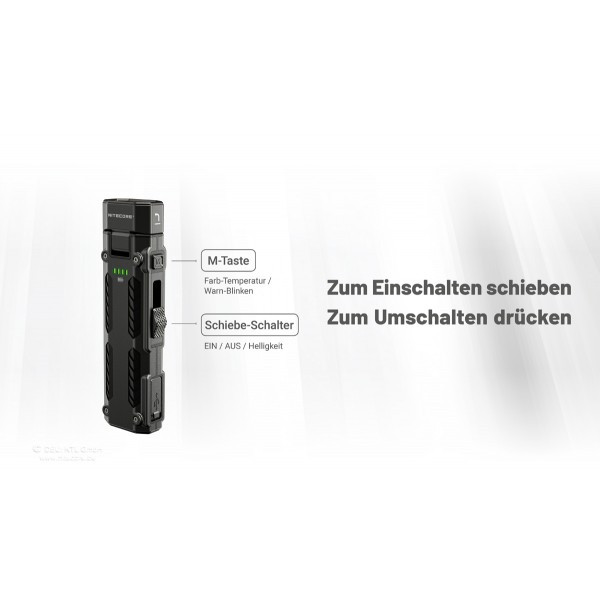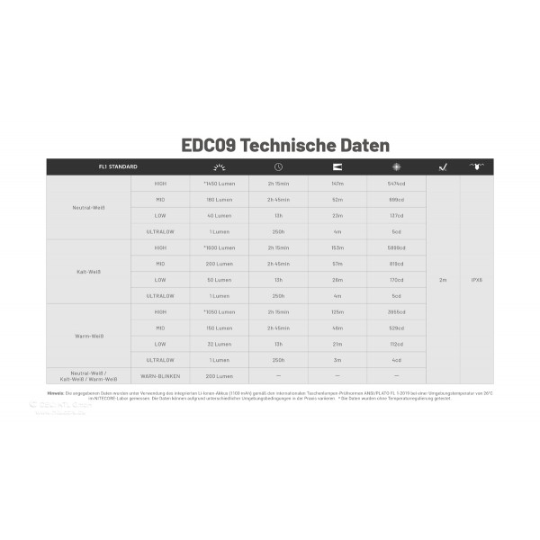 Über den seitlichen Schiebe-Schalter lassen sich die drei Leuchtstärken der EDC09 einfach einstellen. Durch Drücken des MODE-Knopfes wird die Lichtfarbe geändert. Außerdem steht ein ULTRALOW Mode mit 1 Lumen zur Verfügung.