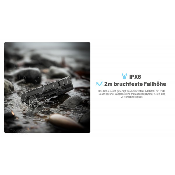 Ein zweiteiliges Edelstahl-Gehäuse mit PVD-Beschichtung sorgen für Robustheit. Die Temperaturüberwachung der Nitecore EDC09 sorgt für eine maximal lange Brenndauer im HIGH-Mode.