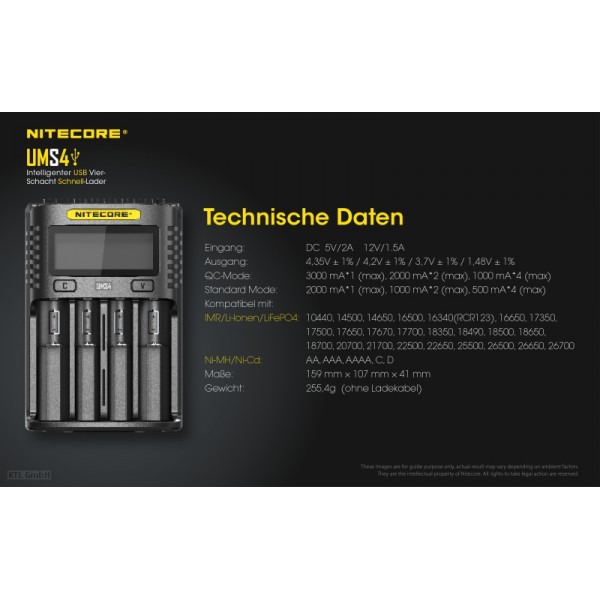 Mit dem UMS4 können Li-Ion, Li-Ion IMR, NiMH/NiCd und LiFePO4 Akkus geladen werden. Das Nitecore UMS4 Ladegerät erkennt den Akkutyp, ermittelt den Akkuzustand, den Ladezustand des Akkus und legt automatisch das richtige Ladeverfahren fest. Als Standard-Ladestrom sind 1000mA voreingestellt. Dieser kann aber manuell, je nach Akkutyp, auf bis zu 2A und im QC-Modus auf bis zu 3A erhöht werden. Maximaler Ladestrom bei einem belegten Schacht: 3A, bei 4 belegten Schächten 1A pro Schacht. Tiefentladene Li-Ion Akkus können im UMS4 reaktiviert werden (Hierzu Bedienungsanleitung beachten).