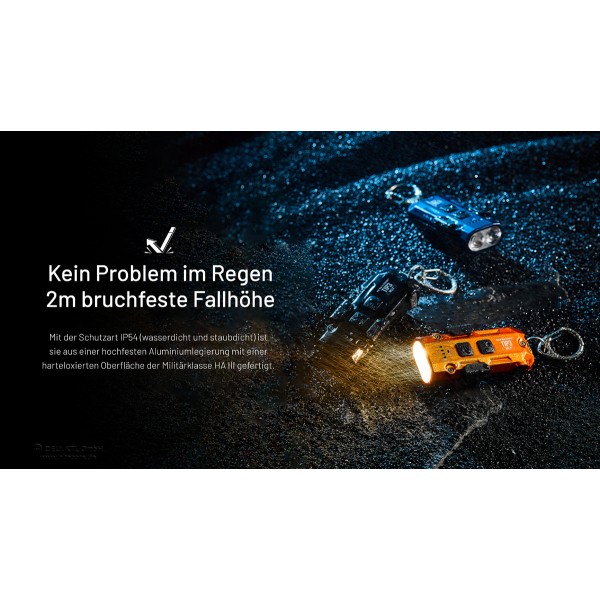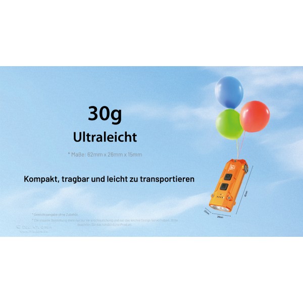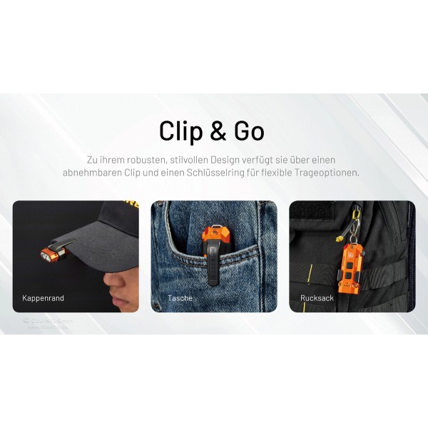 Ideal für Outdoor-Enthusiasten, Handwerker, EDC-Fans und alle, die eine leistungsstarke, kompakte und smarte Taschenlampe suchen. Erhältlich in den Gehäusefarben schwarz, orange und blau.